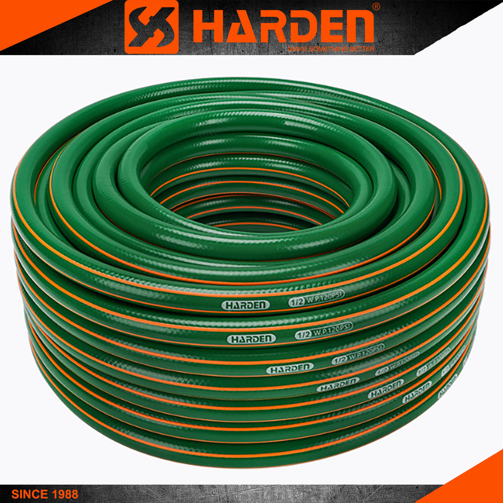 Garden Hose Material: PVC with polyester yarn reinforcement 5-ply construction Sizes : 1/2"x15M, 1/2"x30M, 1/2"x50M, 3/4"x50M Thickness: 2.0mm Working pressure: 100Psi Maximum pressure: 300psi Packed by color paper with shrink