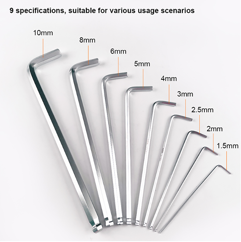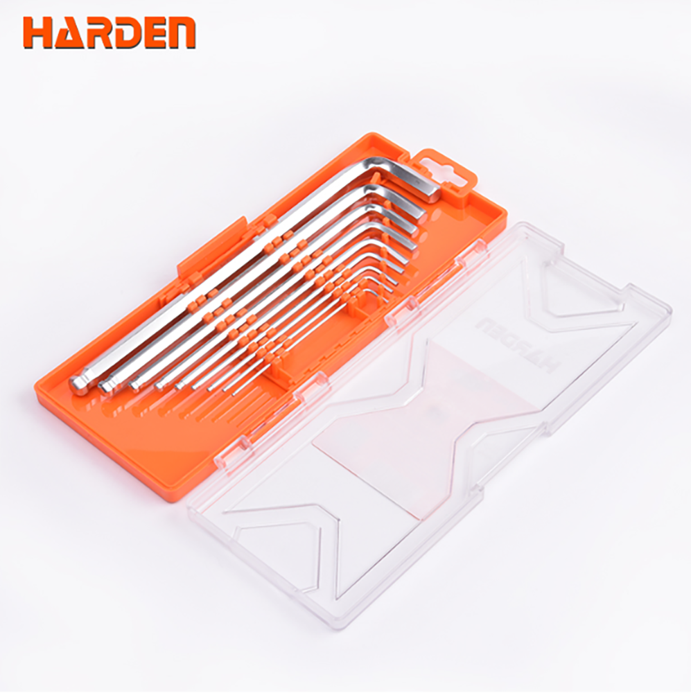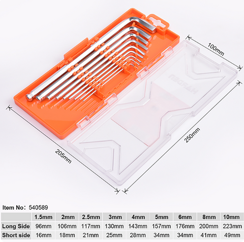 540589 9Pcs Ball Hex Key Set*Material: Cr-V Heat treatment and chrome plate Size range::1.5,2,2.5,3,4,5,6,8,10mm Packed by plastic case