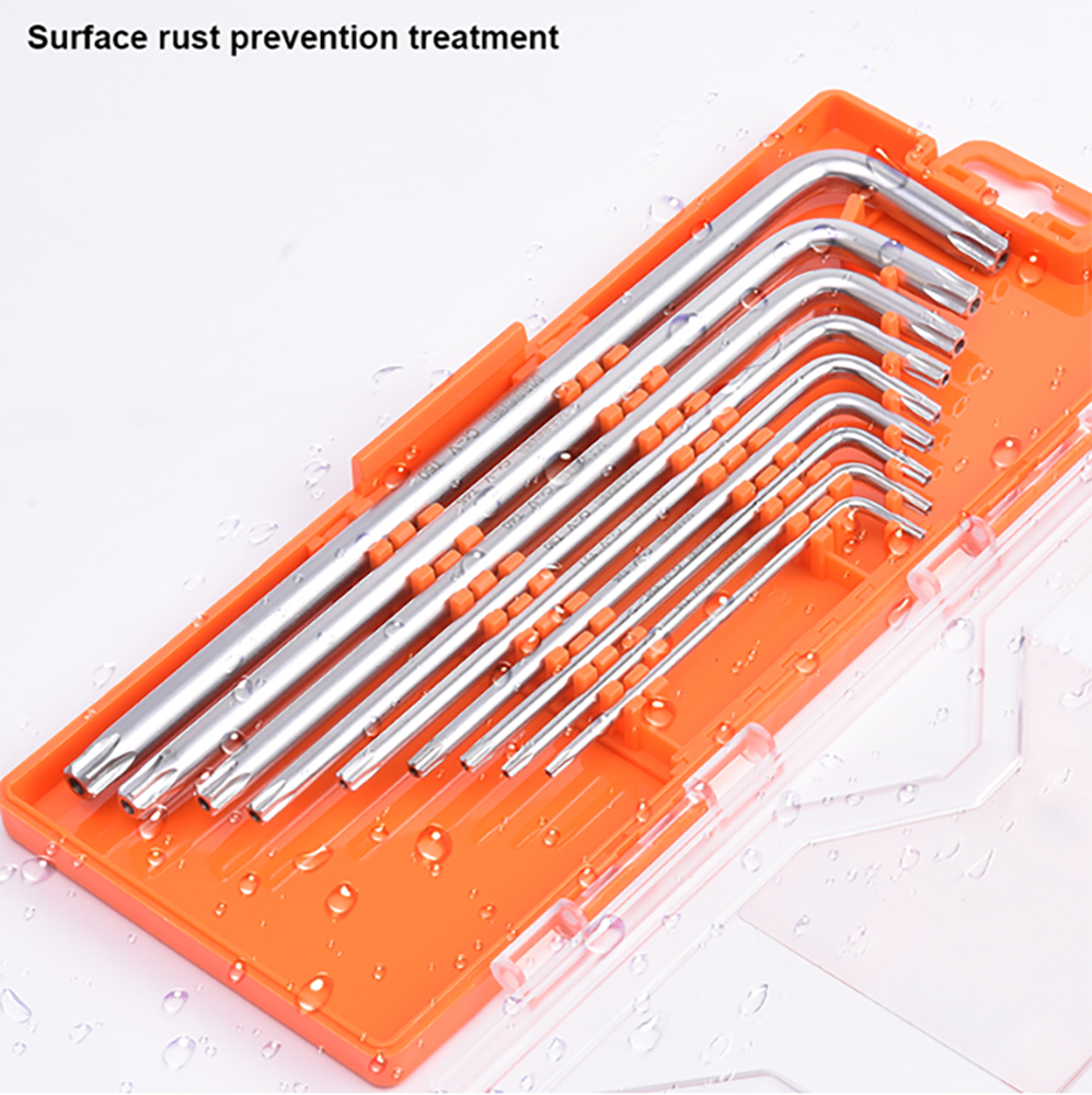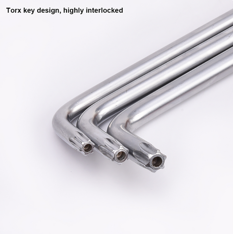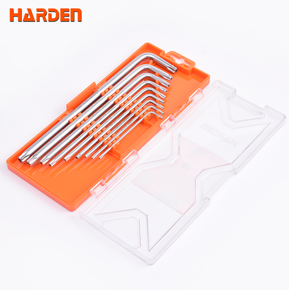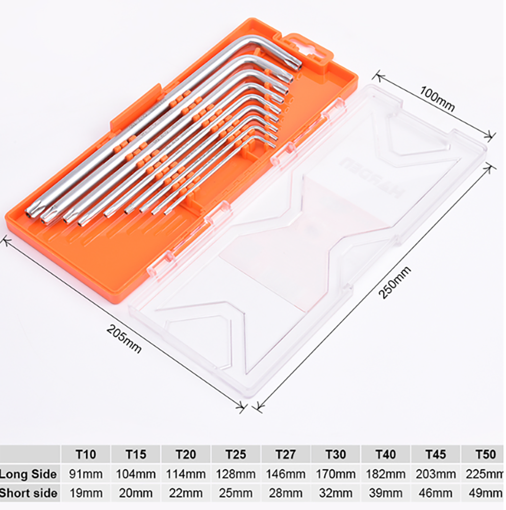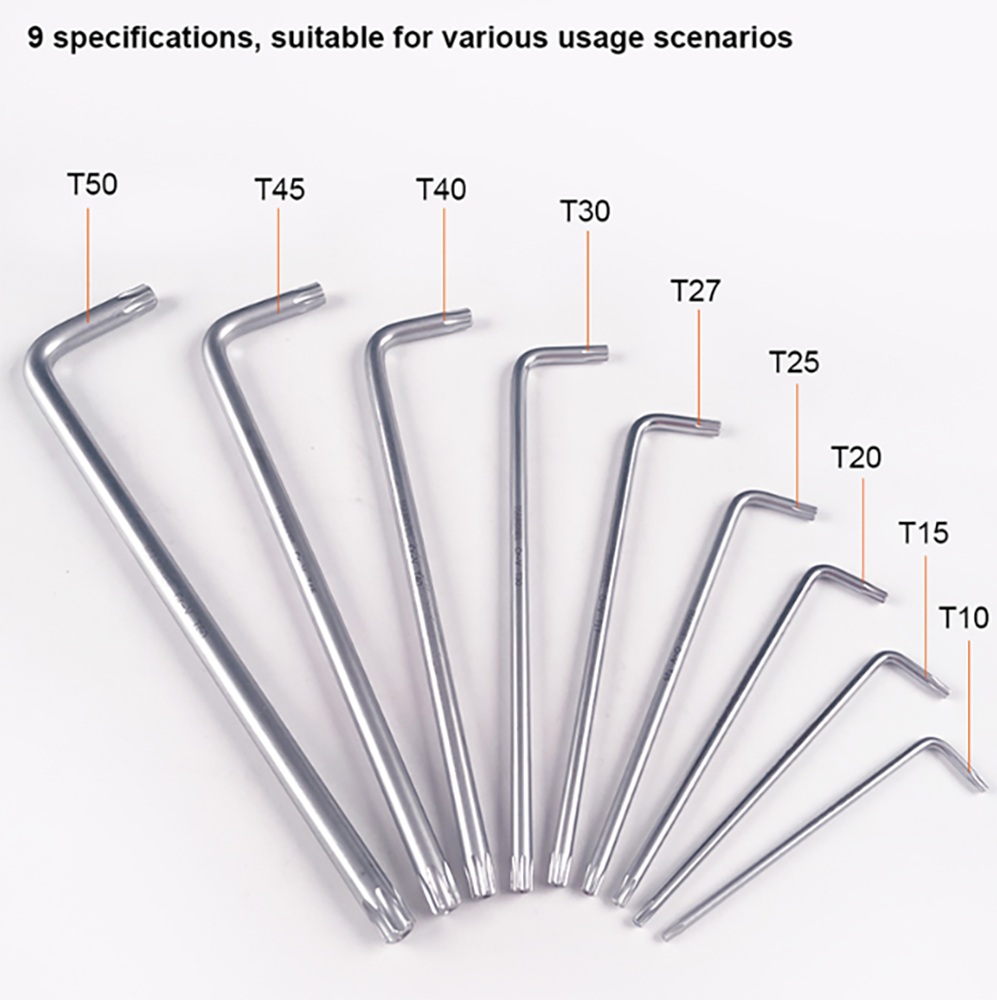 540587 9Pcs Extra Long Torx Key Set Material: Cr-V Heat treatment and chrome plate Size range::T10,T15,T20,T25,T27,T30,T40,T45,T50 Packed by plastic case